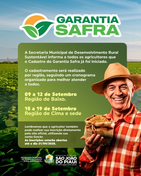 A Secretaria Municipal de Desenvolvimento Rural Sustentável está cadastrando os agricultores rurais para o Garantia Safra 2025/2026. O cadastro será realizado por etapas, conforme cronograma: De…